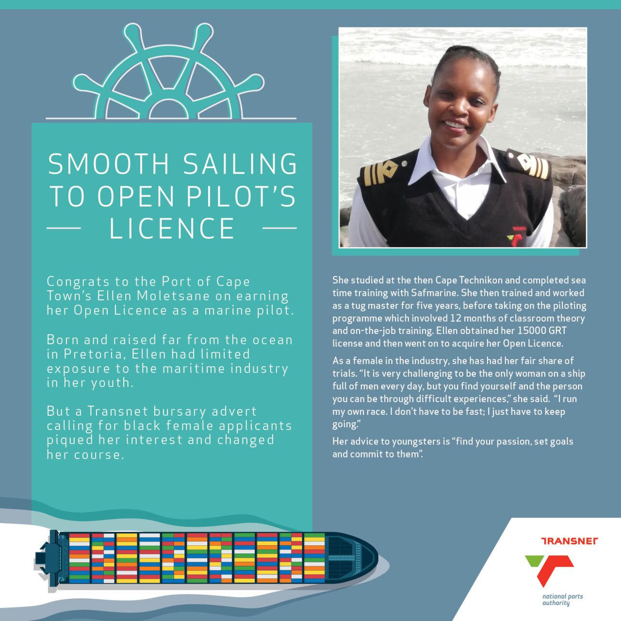 Congrats to the Port of Cape Town's Ellen Moletsane on earning her Open Licence as a marine pilot.Born and raked far from the ocean in Pretoria, Ellen had limited exposure to the maritime industry in her youth.