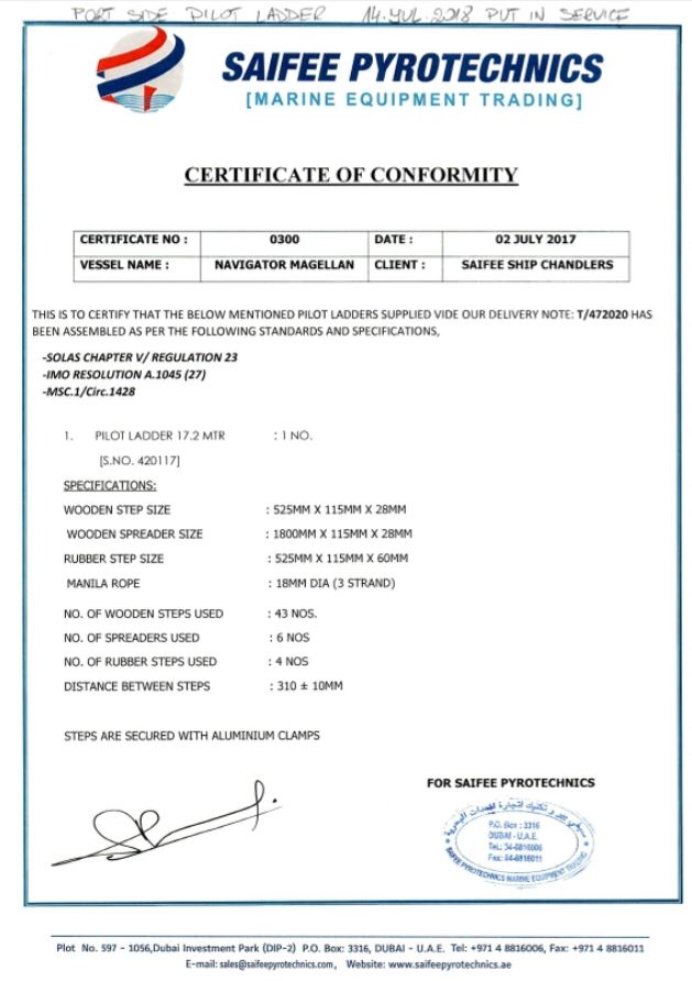 "Is this a certificate or a piece of paper issued by the shipchandler stating that the NON compliant pilot ladder from PRC is compliant, I believe with this kind of practice we will never have safety for the pilots since the people on board simply believe that a ‘certificate’ issued by a presumably well respected company is good and are not aware they offer a very dangerous ladder to the people that need to board the vessel, very sad I believe and we can really not blame the ships operators or their crew."