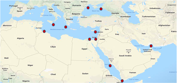 Similarly, The US Coast Guard’s Navigation Center (NAVCEN) investigates reports of GPS interference by civil, non-aviation GPS users and researches these reports and, if possible, establishes the mostly likely cause. In the bulk of reported GPS interference instances in the years 2017-2019, 37 were reported by vessels operating in the Mediterranean Sea, with 22 of those reported in the vicinity of Egypt. In addition, 2 instances were reported in the Black Sea (Odessa, Ukraine and Novorossiysk, Russia). Furthermore, there were 1 instance reported in Hodeidah, Yemen, 1 in the Strait of Hormuz and 2 in the port of Jeddah, Saudi Arabia. The reported locations are shown as red dot on the map above.