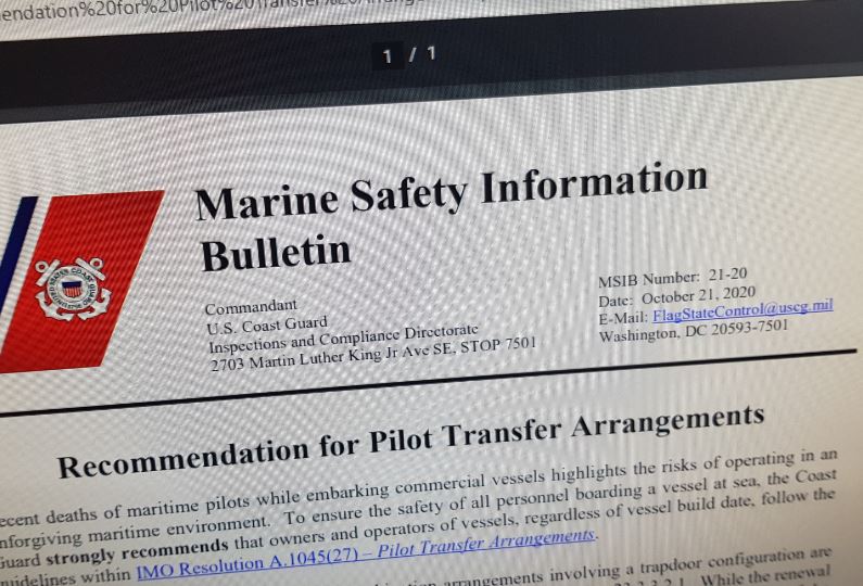 To ensure the safety of all personnel boarding a vessel at sea, the Coast Guard strongly recommends that owners and operators of vessels, regardless of vessel build date, follow the guidelines within IMO Resolution A.1045(27) – Pilot Transfer Arrangements.