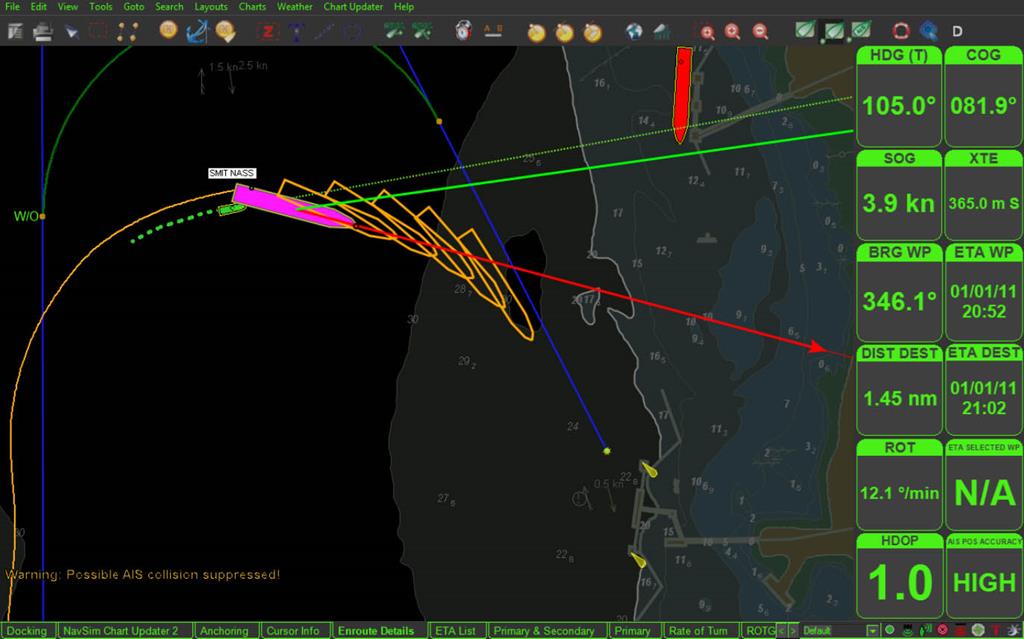 Another handy feature popular with Pilots on confined inland waterways is Meeting Place. A Meeting Place (or Meeting Point) shows the point where you would intersect the route of a selected vessel. It can be activated by hotkey. Simply dragging the meeting point will tell you the new speed needed to reach that meeting point.