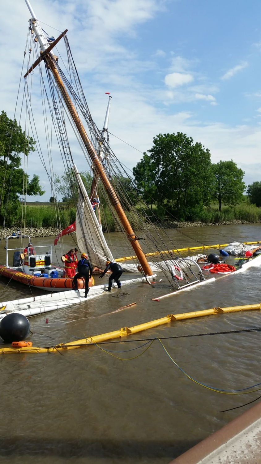 One thing is certain so far: five people have been injured, including one woman, according to the Situation Service. After the collision, the "No. 5 Elbe" was very quickly filled with water, so that the 43 passengers had to be rescued quickly from board. The Stad fire brigade and other helpers were quickly on the spot. The ship was secured with steel ropes to prevent it from slipping deeper into the Elbe. How the two-master is to be recovered is unclear.