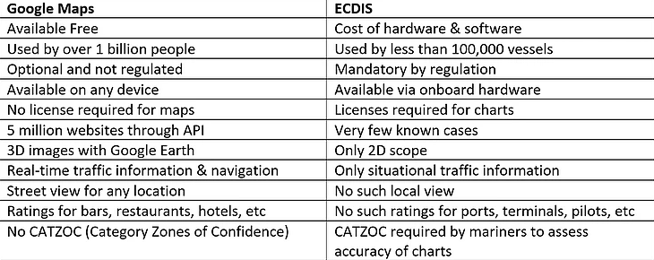 Google Maps turned 15 years old this month and it may be an appropriate time to compare it with similar systems in other industries, hence the comparison with ECDIS.