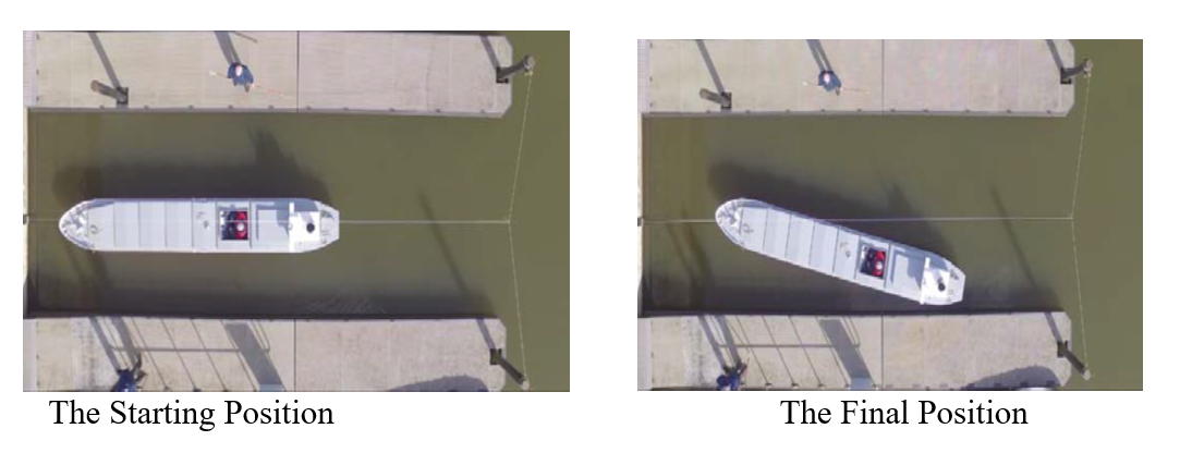 A verification experiment was done in for a panamax vessel. The ship’s turning force was provided by setting the engine half astern. The propeller is right handed with fixed pitch. For the purpose of analysis, the whole experiment was divided into 8 time intervals. In each interval, the result was analysed calculating the position of the pivot point as the average in the interval. The positions are given as percentage lengths between the bow and the pivot point, to the length of the ship. The experiment shows plainly that the pivot point was at around 17% of the ship length from the bow. Near the end of the experiment, it is obvious that the pier is interfering with the water flow being created by the propeller.