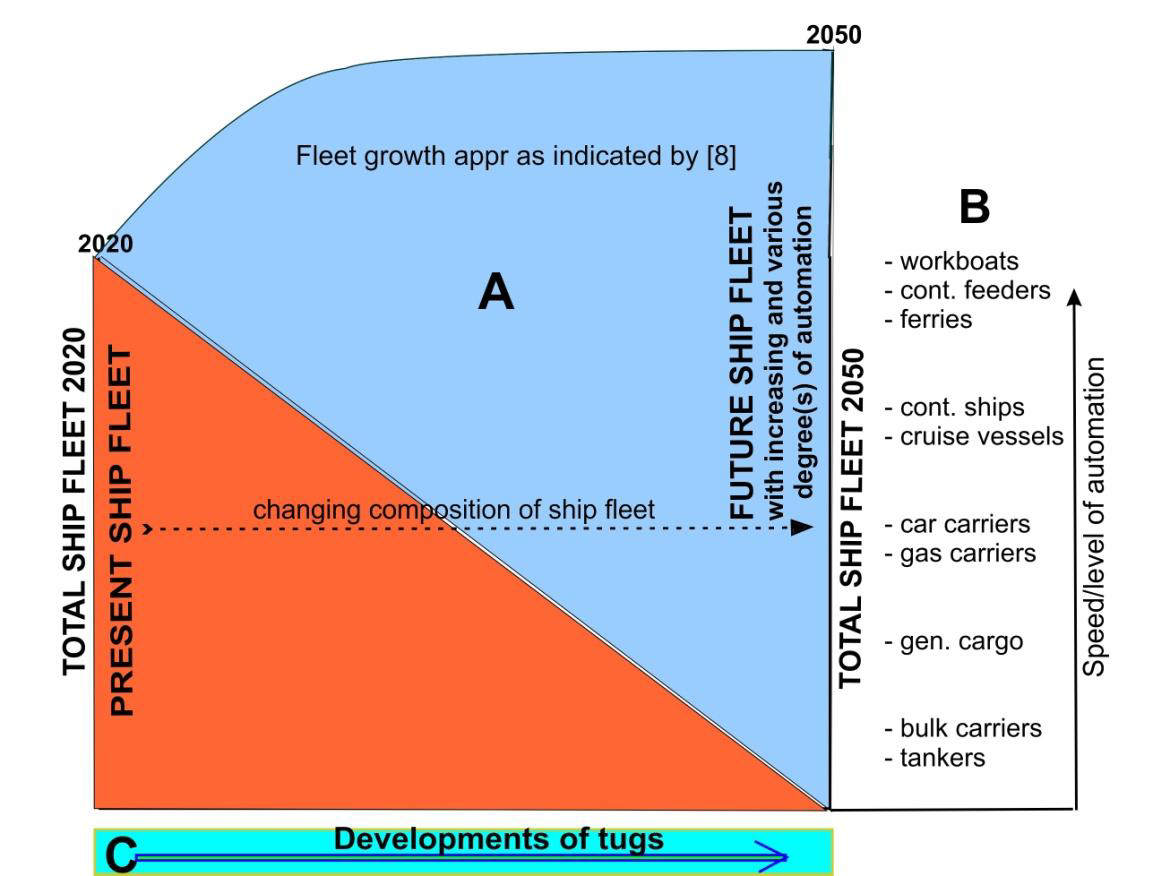 In part A of figure 1 is shown the gradually decrease of present ships to zero in the coming period of 30 years and the large increase in ships with some kind of automation in the same time span, including a growth in world ship fleet tonnage, which is based on the estimates of DNV-GL [8]. With respect to the latter, UNCTAD expects a much larger growth of global seaborne trade, viz. approximately 1.7 as high as indicated in figure 1; compared to 2016 the cargo to be transported will triple by 2050, which has large consequences for ports and port services like tugs [24].