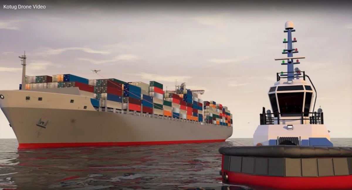 If the limitations of drones could be overcome and no legal restrictions are in force for the use of them, it might become a good system to make a connection between tug and ship.