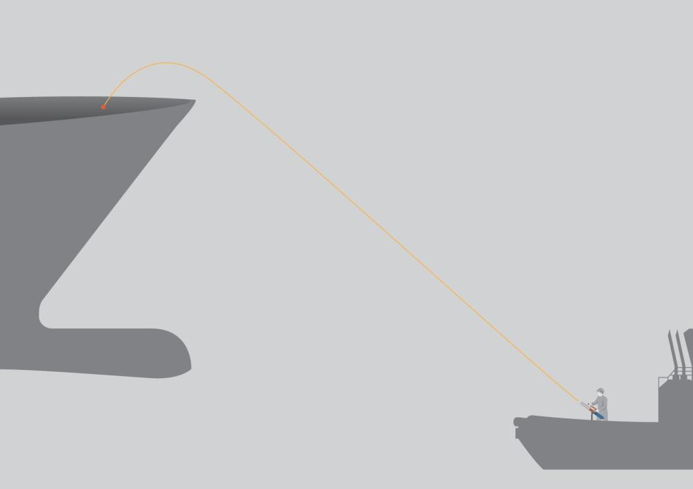 Connecting towlines. A crucial issue. At present in nearly all cases heaving lines are used for passing a towline. From the foregoing it will be clear that near the bow of a ship with headway the use of heaving lines includes risks, because the tug has to manoeuvre very close to the ship at speed and comes in a risky situation due to the effect of the earlier mentioned interaction forces. Whatever modern, remote controlled or autonomous, tugs will be developed, the fastening of tugs should be as safe as possible at speeds up to 10 knots. Clearly, as mentioned before, high maximum tug speeds and course stability ahead and astern becomes more important.