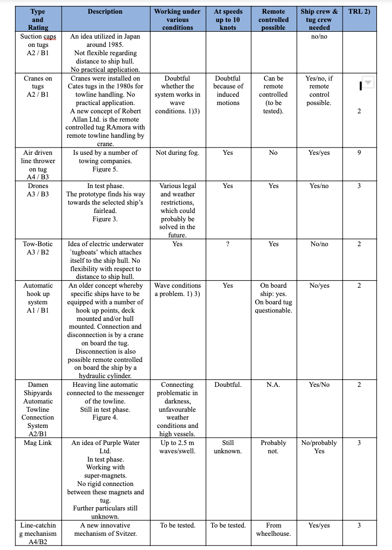 From table 2 it can be seen that already for more than 30 years efforts have been made to develop an easy connection system, and that systems that were developed failed in the real world situations, except for the air driven line thrower. The air driven line thrower has also a few drawbacks, such as inaccuracy when used from a moving tug deck, the risk of hitting a ship’s crew member and limitations in case of reduced visibility. Nevertheless, it is used on some tugs.
