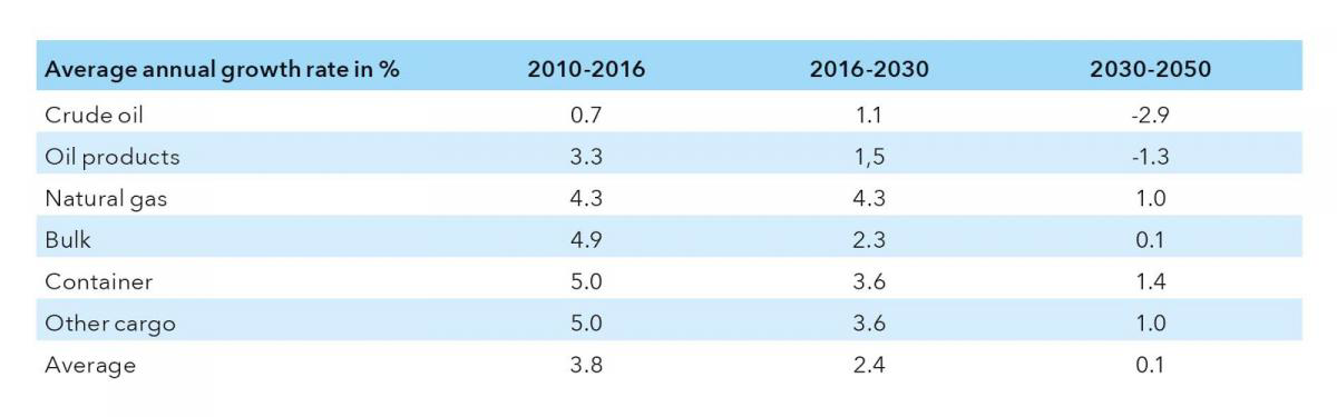 Table 1 shows how seaborne trade is expected to change till 2050. DNV-GL forecasts a 39% rise in seaborne trade measured in tonnes over the period 2016–2030 and a 2% rise for 2030-2050. The largest relative growth in transportation demand is for gas and container cargo, both growing about 120% to mid-century [8]. Transport of crude oil and oil products decreases quickly after 2030. See also the much higher seaborne trade expectations of UNCTAD mentioned in par. 2.1.1.