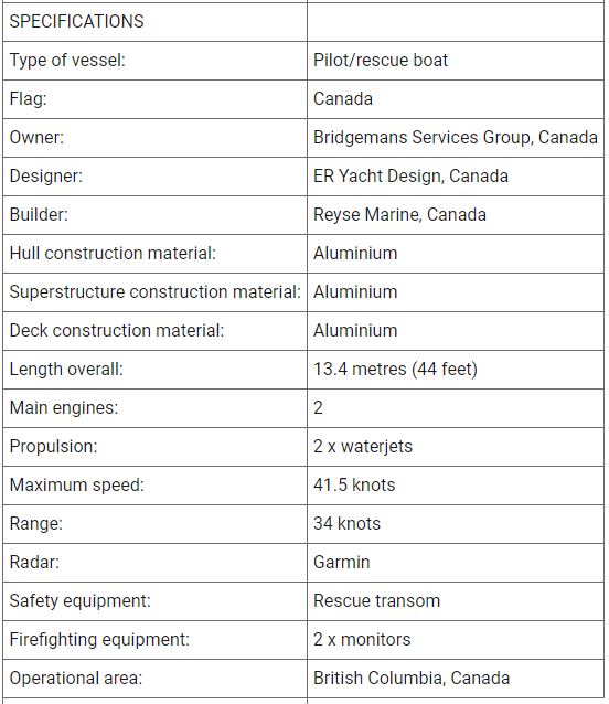 The aluminium hull is durable enough to withstand the impact of logs and debris and to permit beaching if necessary. The wheelhouse has forward-leaning windscreens to reduce glare from the helm station and upward-facing windows to provide the coxswain with enhanced situational awareness, particularly when manoeuvring alongside larger vessels during pilotage and emergency response operations.