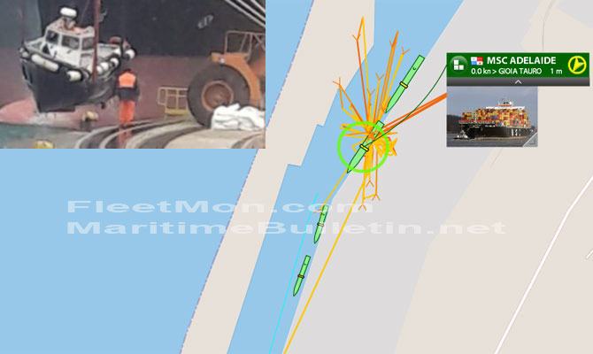 MSC container ship struck mooring boat while moving in Gioia Tauro harbor, Italy, on Jan 18. Pilot boat sank, after understood, being crashed between container ship bulbous bow and pier, but was quickly recovered by crane and placed on pier. Boat luckily, was unmanned at the time of an accident. Container ship wasn’t identified, and there are 3 MSC container ships at Gioia Tauro, as of evening Jan 18, but available information points at MSC ADELAIDE, she was in process of berthing on arrival from Genoa.