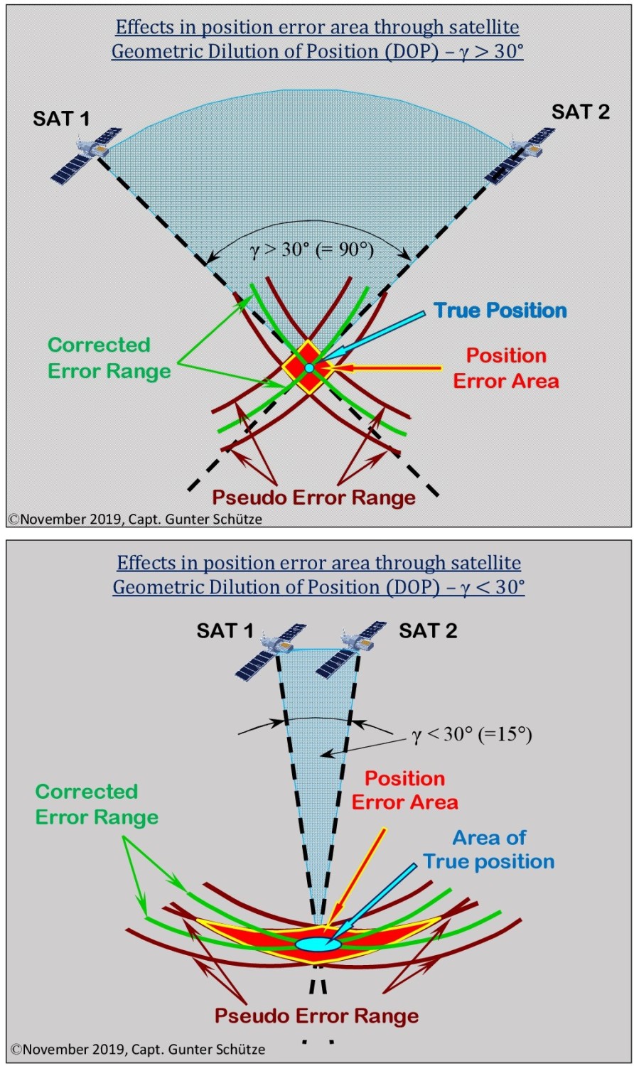 The more acute the angles between the satellites observed, the less accurate the position determined. The background to this is that the intersections of the distance lines of corrected distance and pseudo-error removal result in large error areas in comparison to distance angles of > 30 °.