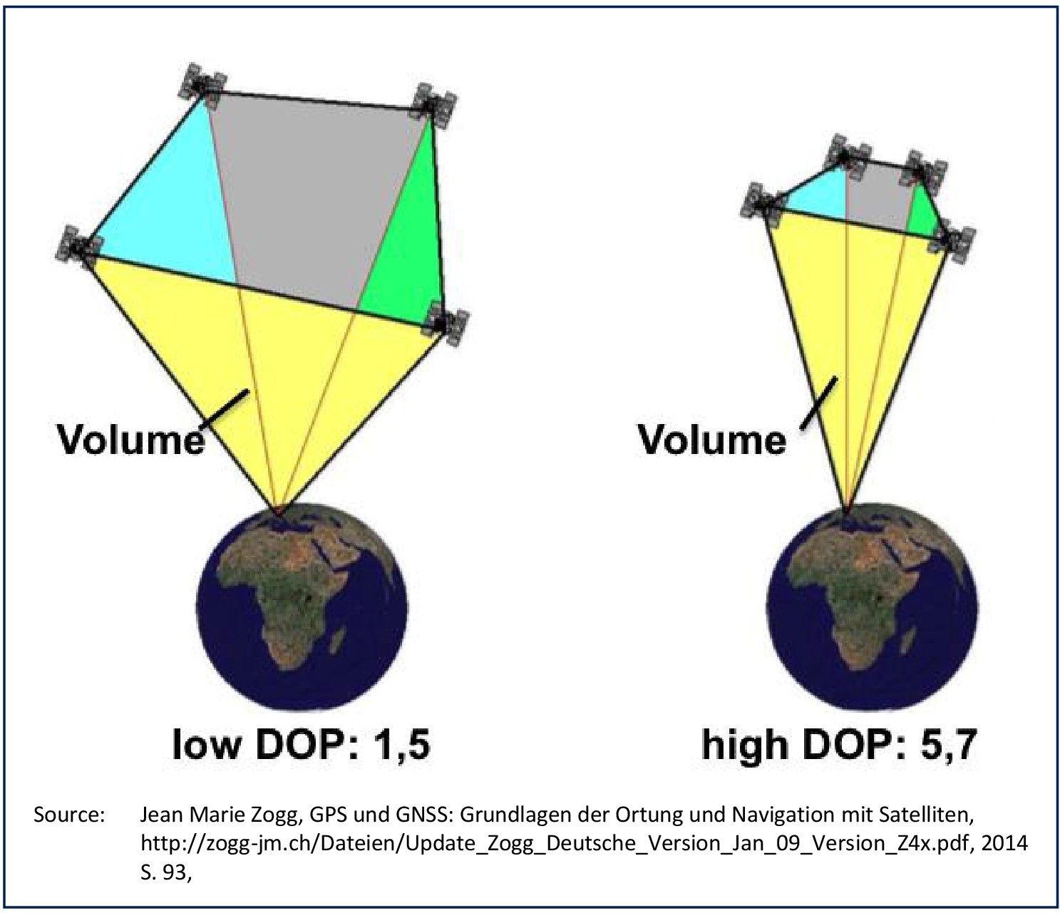 The accuracy of positioning with satellites is highly dependent on the satellite geometry, that is, the distance angles between the satellites. It is called DILUTUON of POSITION (DOP) and stands for the influence of satellite geometry on the measurement accuracy. In other words - DOP - stands for the weakening of the position accuracy and is thus a measure of the satellite constellation-dependent inaccuracy.
