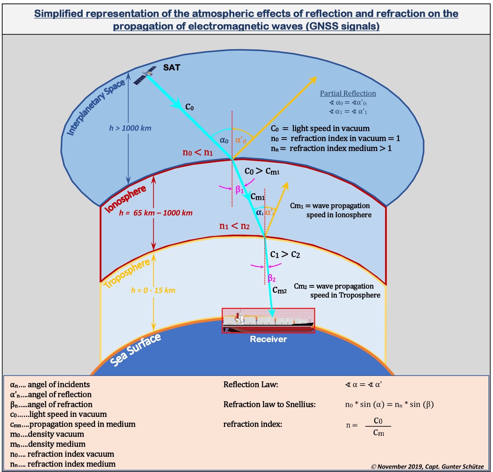 Since we are dealing at satellite signals as electromagnetic waves, they are also subject to the laws of physics of the propagation of waves. Especially when waves enter media of different densities. This means that the physical principles of refraction and reflection come into play. On the way from the satellite to the receiver, the electromagnetic waves undergo three different media of different ionization and density, which influence the wave direction and the propagation velocity of the wave. Since satellites in GPS at a height of 20200 km have their orbit around the earth, we have to divide into 3 different spheres:
