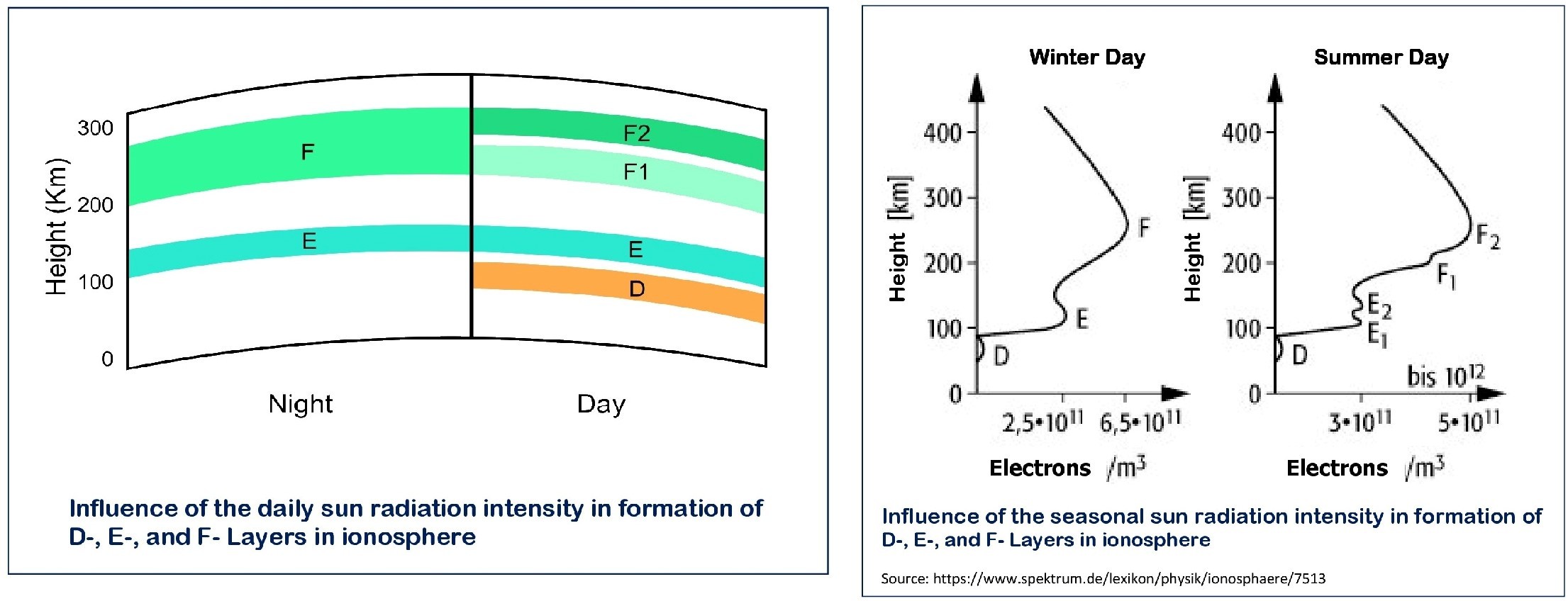 As mentioned, the structure of the ionized D-, E-, and F-layer is strongly dependent on the influence of the daily and seasonal sun-rise and the associated radiation intensity of the sun. How this is pictorially illustrated are shown in the two following graphics.