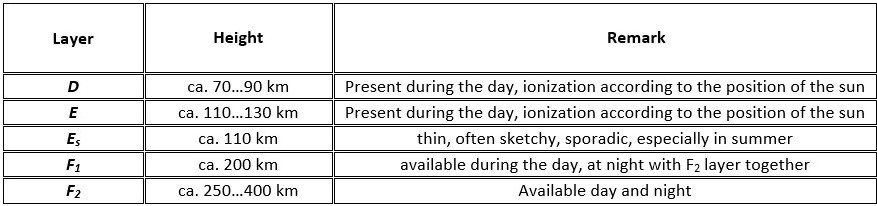 The factors mentioned have a significant influence on the character of the ground and space waves in the different frequency ranges of long / medium and short waves and can reach ranges of up to 1000 km in the best case. With overreach up to 2500 km are possible. The following table shows the structure of the 3 local layers and their sublayers of the ionosphere.