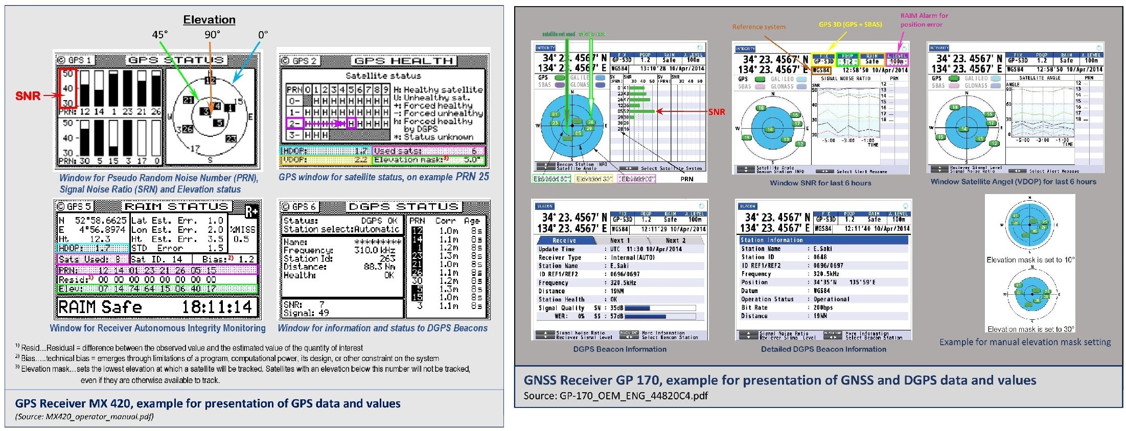 Under normal conditions, satellite elevations between 15 ° to 75 ° elevation are the most favorable angles for maritime GNSS receivers to limit rangefinding errors due to atmospheric disturbances. However, it is possible by manual adjustment to change the elevation angle to be used. Likewise, in the GNSS (GPS) configurations, the sub-menus of the receivers display the values for HDOP and VDOP, thus providing information about the quality of the satellite data and thus the accuracy of the distance measurement. Depending on the particular manufacturer of GNSS receivers, they are also referred to as Satellite angle or VDOP. Signal to Noise Ratio (SNR) describes the signal quality and is represented by various diagram shapes (bar graphs, line graphs).