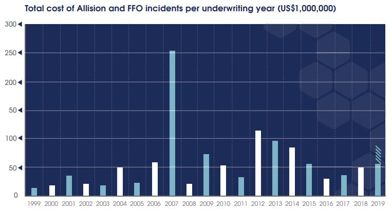 As may be expected, incidents in the Allision/FFO category constitute the majority – 60% of the total number – and cost in excess of US$1.14bn. Collision incidents represent 31% of the total number and cost in excess of US$479m.