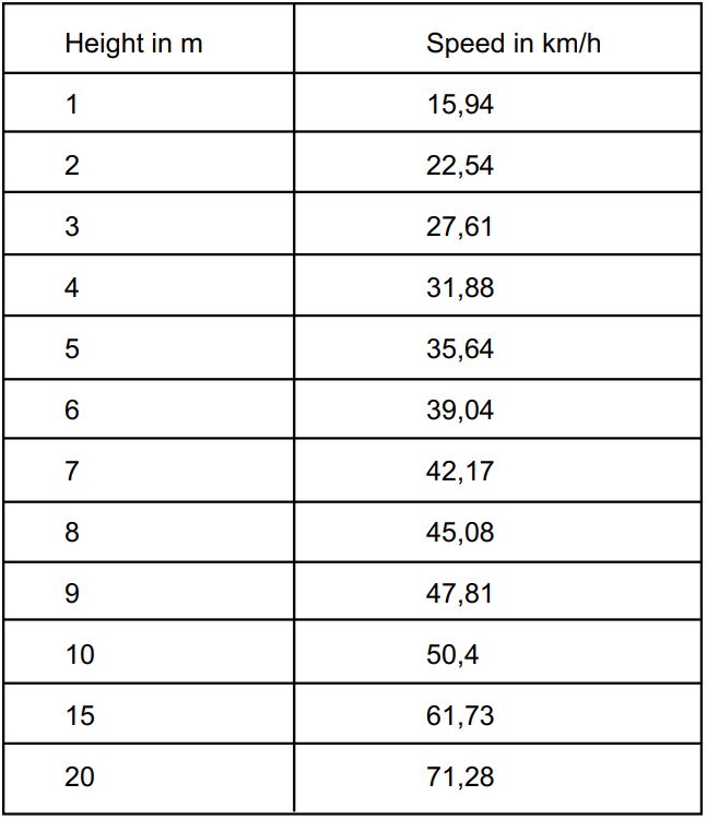 This is quite different than the maximum climb of 9 meters the pilot ladder poster mentions. People have died falling from heights. Dropping from a height of more than 9 m will most certainly result into fatal injuries. Falling from lesser heights gives you a chance of survival. The table below in which I put dropping height in relation to speed illustrates this. Dropping from a height of even 3m will result in a final dropping speed of almost 28 km/h before you’ll hit the deck… from 10 meters even 50km/h, like driving into a wall.