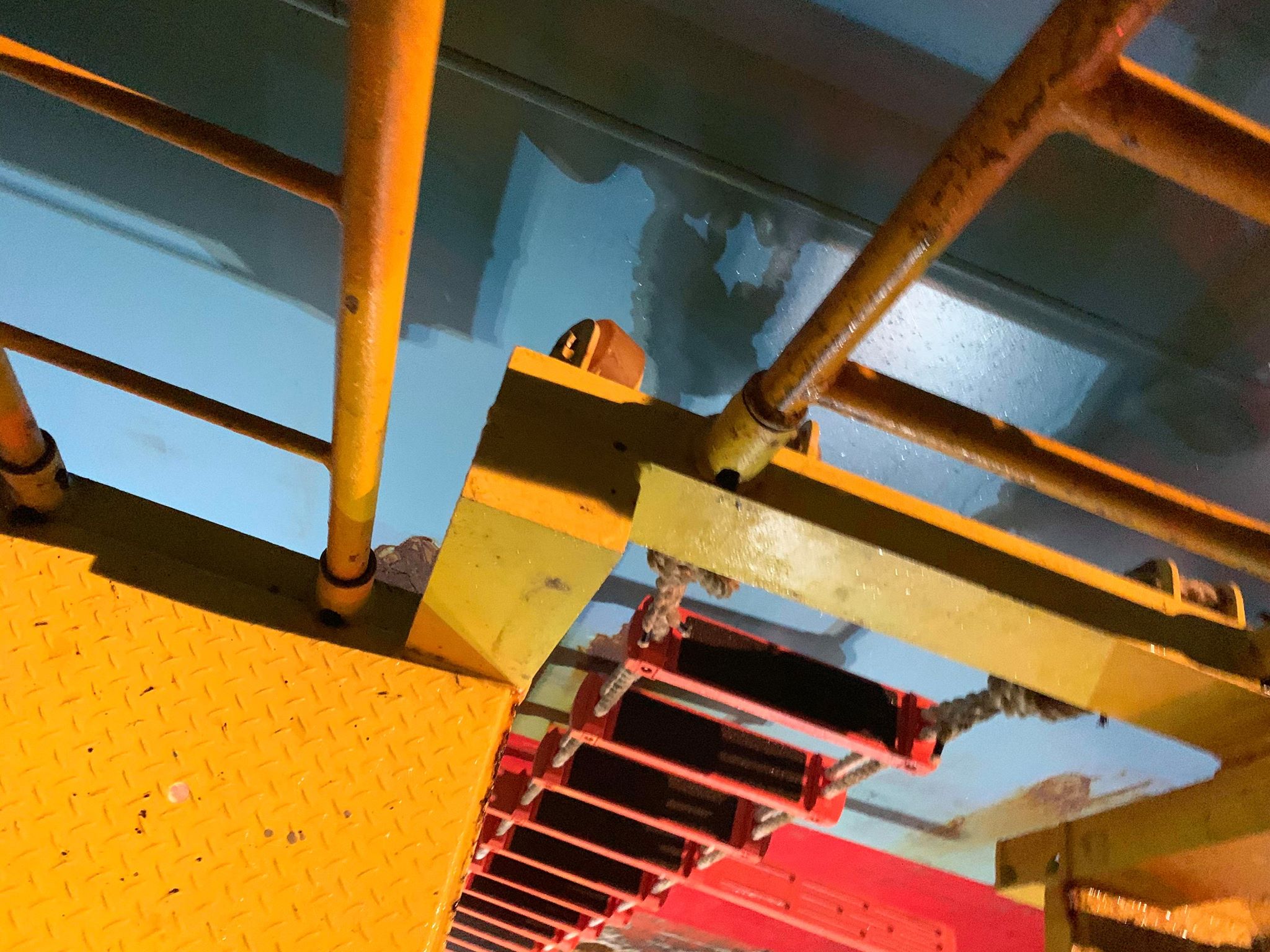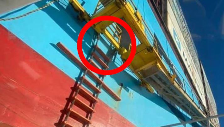 In my opinion: Nothing!Nothing has been changed on board the Maersk Kensignton, the ship continues to sail with a non-compliant "trapdoor arrangement". Some also speak of a "widow maker". All ships of the Maersk "K-Class" have the same combination ladders. They are not allowed and do not comply with the rules!