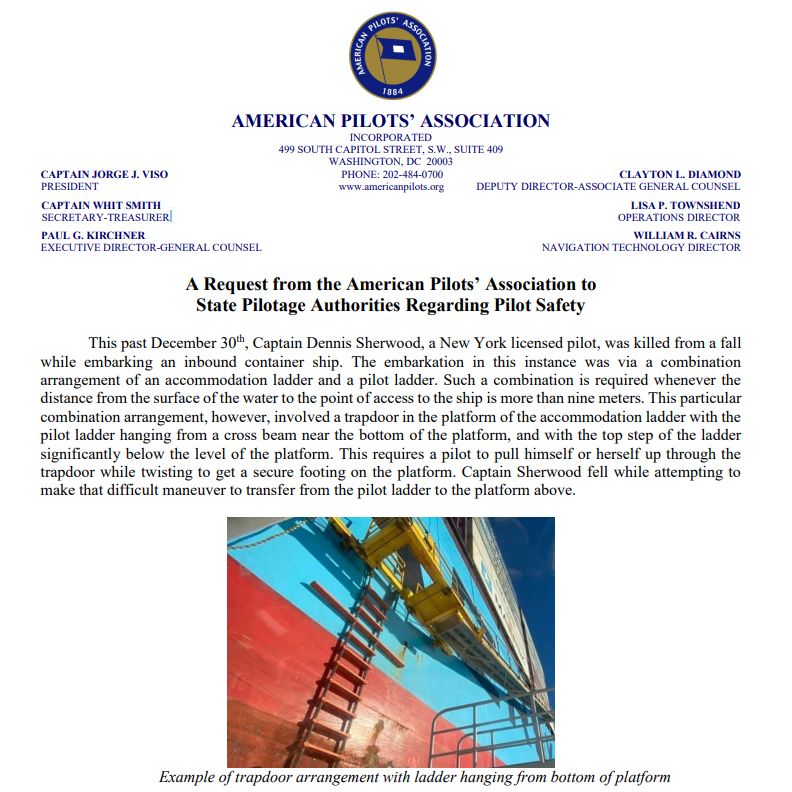 The American Pilots’ Association has sent a letter to state pilotage authorities across the United States on behalf of approximately 1,200 American ship pilots to improve safety pilot safety following the death of a New York pilot in December.