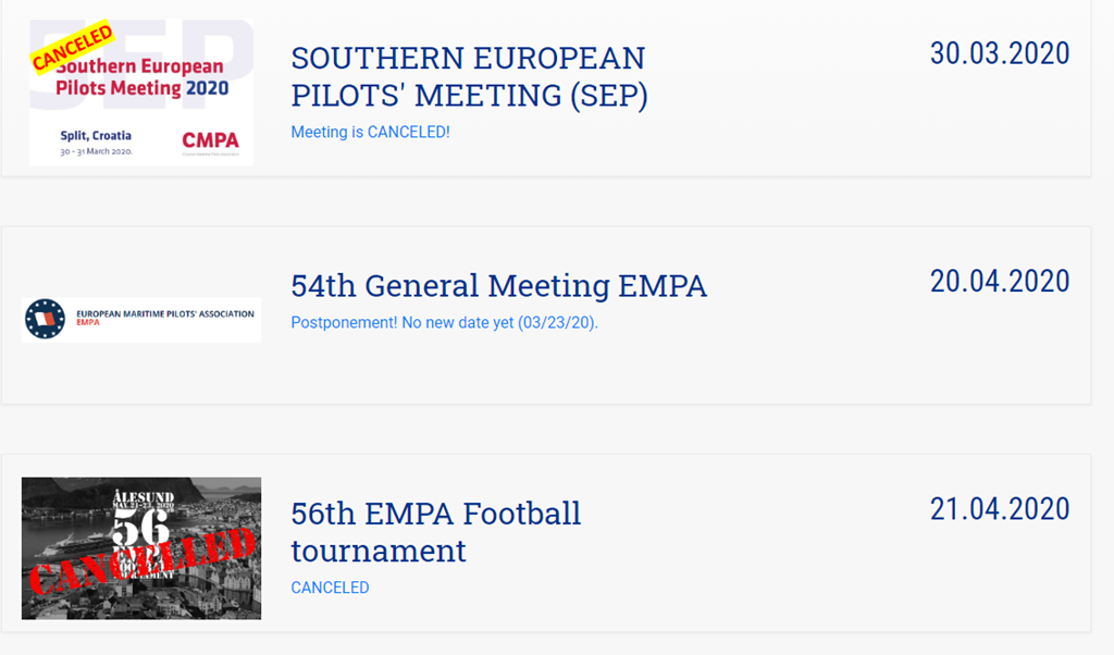 What events and meetings for Maritime Pilots are scheduled? Which events are canceled or postponed?