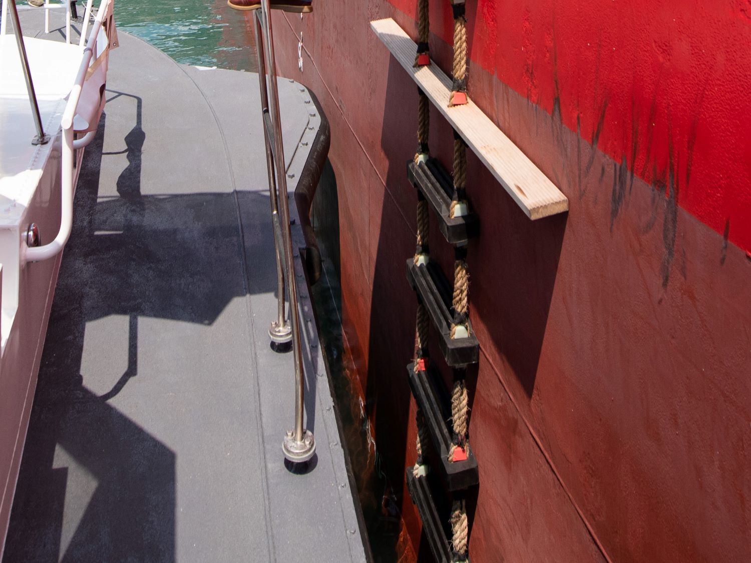 1) This modification was created to avoid the entrapment of the pilot ladder and only concerns the main deck. Obviously the boarding platform should be arranged to guarantee the safety of the pilot. The distance between the pilot ladder and the side of the boat is around 70-80 cm, which is about an arm's length.