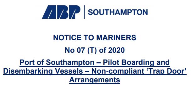 NOTICE IS HEREBY GIVEN that some ships have a pilot transfer arrangement consisting of an accommodation ladder / pilot ladder combination with a trapdoor that does not meet IMO standards in effect since at least 2012. Southampton Pilots have been reminded that they may refuse to use a pilot transfer arrangement that they reasonably believe is unsafe, particularly the offending trapdoor arrangement. All vessels with a trapdoor arrangement are urged to bring their arrangements into compliance with the current IMO standards as soon as possible in order to avoid potential disruptions to ship schedules and port operations.
