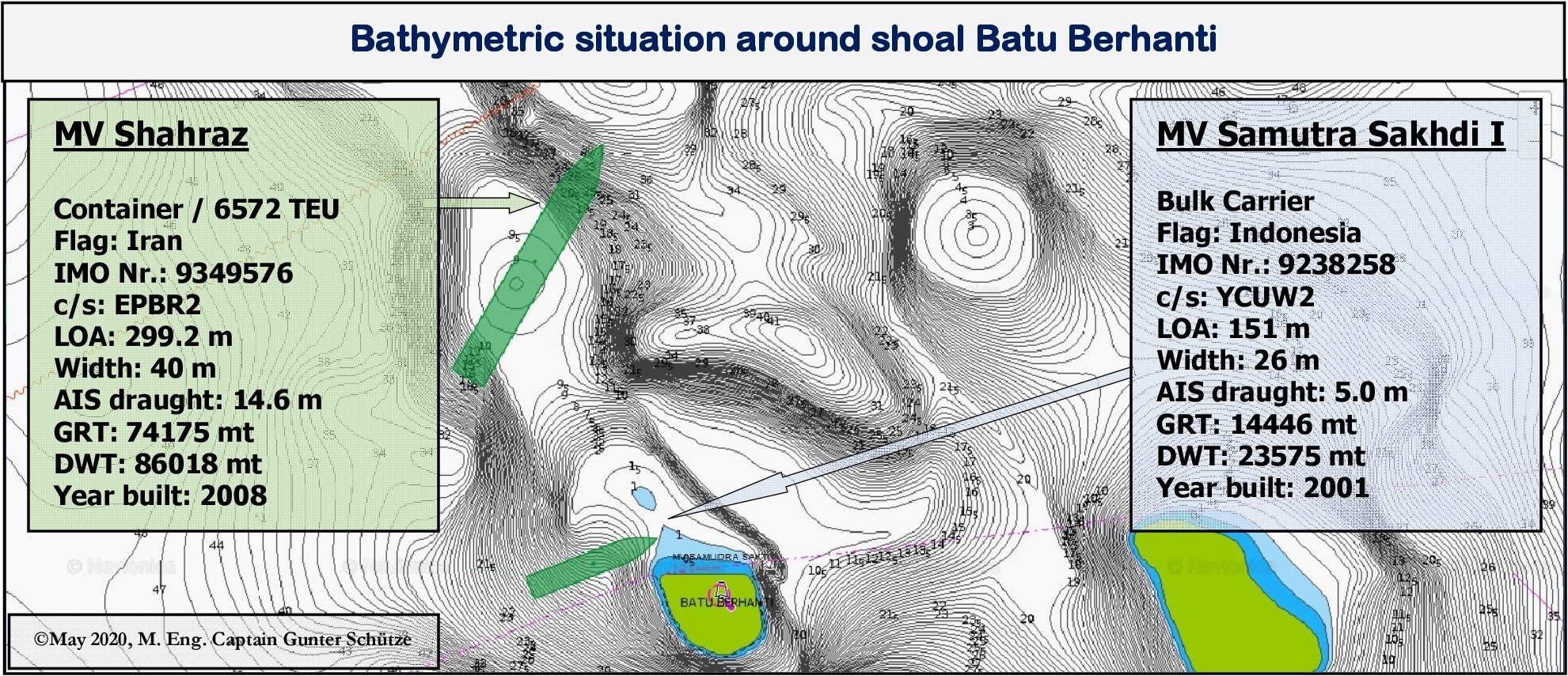 MV "Shahraz" and MV "Samudra Sakti I" had run aground to the shallow Batu Berhanti in the Indonesian territorial waters within 6 minutes, which is surveyed with minimum water depths of 8.3 m in the northern part and up to 0.5 m in the southern part . It is located south of TSS Singapore Strait’s eastbound traffic lane.