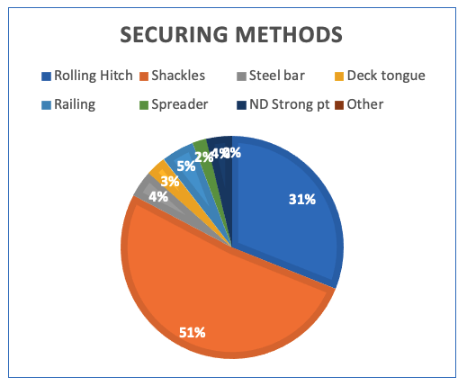 From the survey, no relationship could be established between securing method and ship type or securing method and geographical area. In other words, all securing methods are in use on every ship type, worldwide.