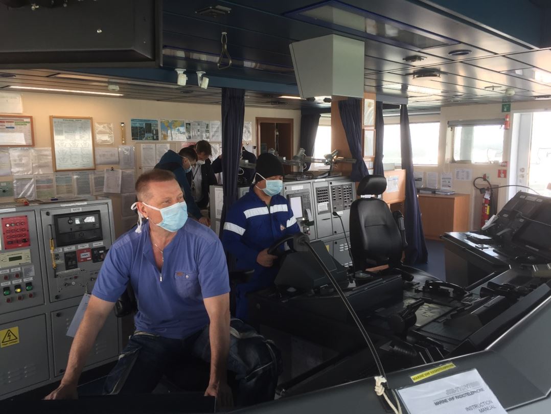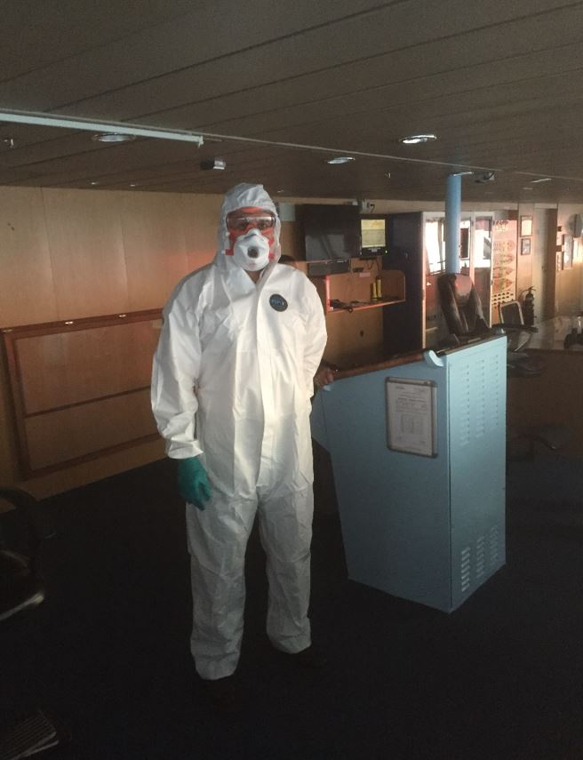And what is the bridge team wearing? Masks? Gloves? Either? Both? Even now, a month into lockdown, there is still no clear-cut decision on the efficacy of either outside the clinical setting. Shipping companies and individual vessels have introduced their own individual requirements. An Italian tanker company, perfectly understandably, has introduced a quite stringent procedure. Before entering the wheelhouse I’m required to dip the soles of my shoes into disinfectant and don surgical gloves and mask. But none of the ship’s staff wore gloves or mask. A few ships have managed to acquire electronic infrared thermometers, so my temperature is checked before entry, (invariably, if the design of the ship allows, I now always taken up the external stairway). On other vessels all the bridge team were also wearing gloves and masks. But they removed the masks to smoke on the bridge wing and to drink their coffee. At no point did I see them sanitise their gloves, though they were all using the same equipment.