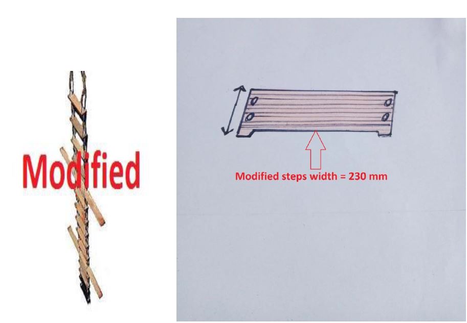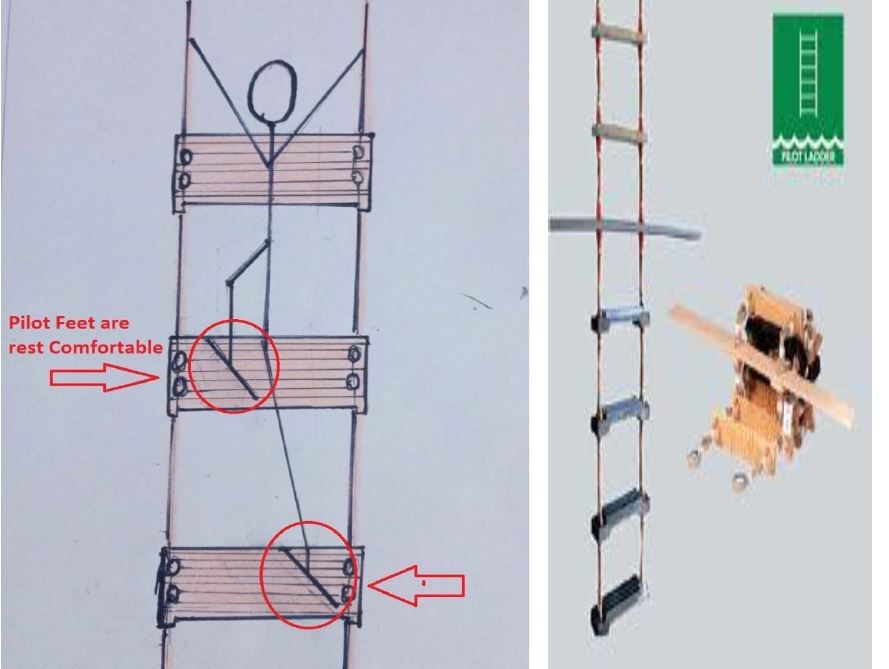 What I suggest that if we make an experiment, the width of ladder steps to be increase to make it double of 115mm. If we convert it will be 230mm steps width will be considered. It could be more safer while climbing up or down the Pilot feet will be fully & exactly placed on ladder steps . Wide steps for safe and comfortable boarding. I think it will minimize the risk of Pilots falling or occur incident.