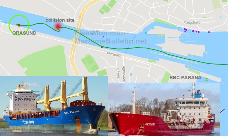 Ships weren’t identified, but according to tracks, tanker ORASUND and general cargo ship BBC PARANA were involved. ORASUND is en route from Liepaja Latvia to Ireland, BBC PARANA is en route from China to Umea Sweden. As of 1420 UTC Jul 27, both ships remained berthed in Kiel. Reportedly, ships didn’t report water ingress, nor there was any leak.