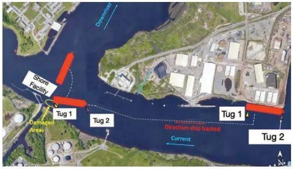 As the manoeuvre progressed, the backing speed increased to about 2.9 knots. The aft tug (tug 1 in the diagram) was pushing at full power in an attempt to push the vessel’s stern north, away from the shore facility.