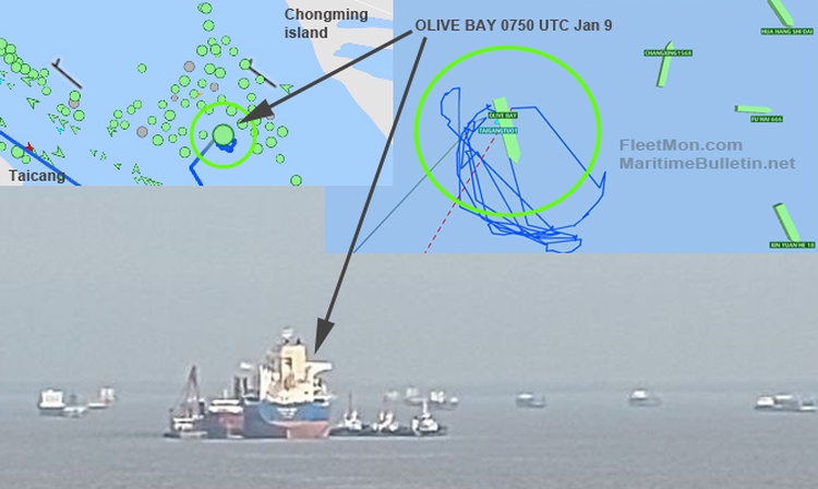 According to Captain’s visual observance and overheard radio talks, bulk carrier OLIVE BAY anchor chain entangled with the chain of another ship, on Jan 8 or 9, in Yangtze estuary between Chongming island and Taicang, Shanghai area. Floating crane and tugs responded, trying to disengage chains and free the ships.