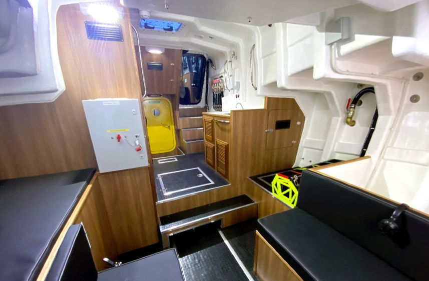 The forward cabin features bunk berths allowing the pilots to rest and relax comfortably during transits at nighttime. This area of the boat also provides increased seating capacity that can be utilised in an emergency, or when additional passenger seating is required. All cabin spaces feature air conditioning while the interior noise level is maintained to 74 dB thanks to specialised laminates and trimming.