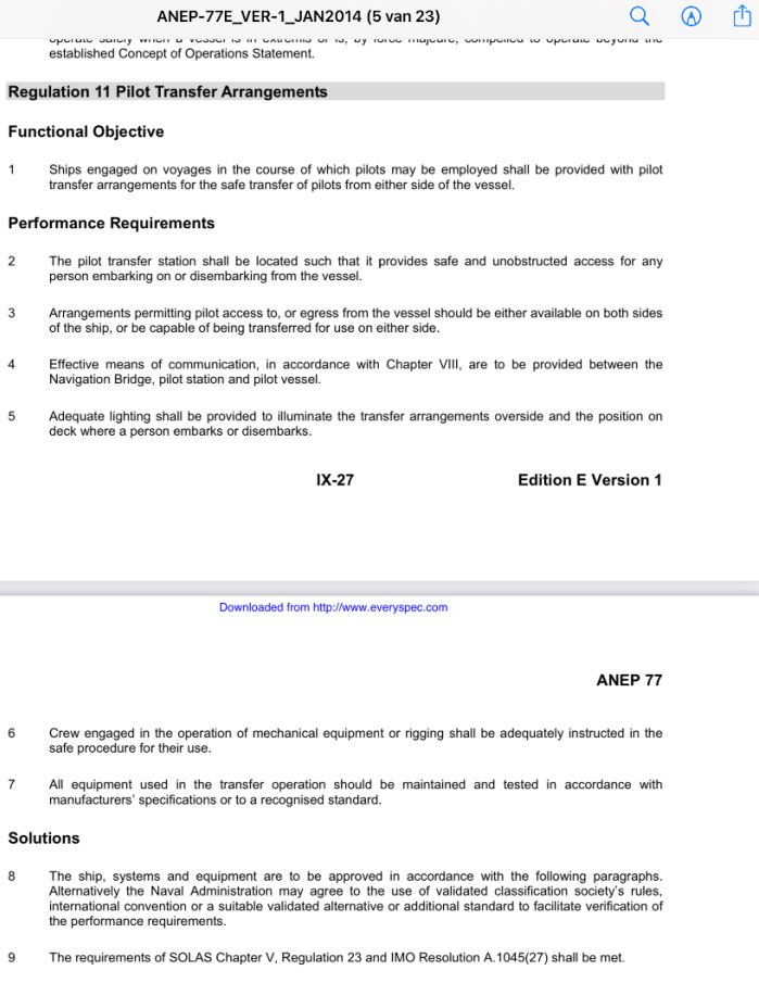 The text ends with: The requirements of SOLAS Chapter V, Regulation 23 and IMO Resolution A.1045(27) shall be met. This is an important one: NATO states here that all pilot transfer arrangements shall be compliant to SOLAS and IMO. So, whenever a NATO navy ship claims they do not have to be SOLAS compliant (a stupid excuse for not having to be safe…), you can revert to the ANEP77 and tell them that according to the ANEP77 their pilot transfer arrangement has to be SOLAS and IMO compliant.