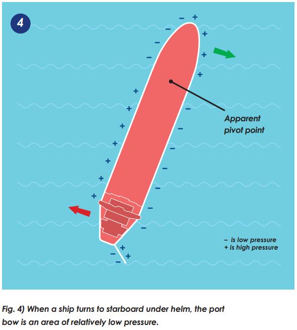 It has been a few years since the publishing of “The Pivot Point?” in The Pilot October 2008.One of the consequences of the concept is a need to refresh the representation of the water pressure around the hull in ship handling books. The diagram showing positive pressure on the port bow when a ship turns to starboard is a classic. It was the cornerstone of the previous explanation for the shift of the pivot point. The bow is shown "leaning on” the compressed water, pushing the pivot point ahead. At ship handling speed, this pressure diagram makes little sense and should be corrected. The part of the ship ahead of the pivot point is moving to starboard and creates a void in the area of the port bow (fig. 4). So, negative signs should appear in that zone.