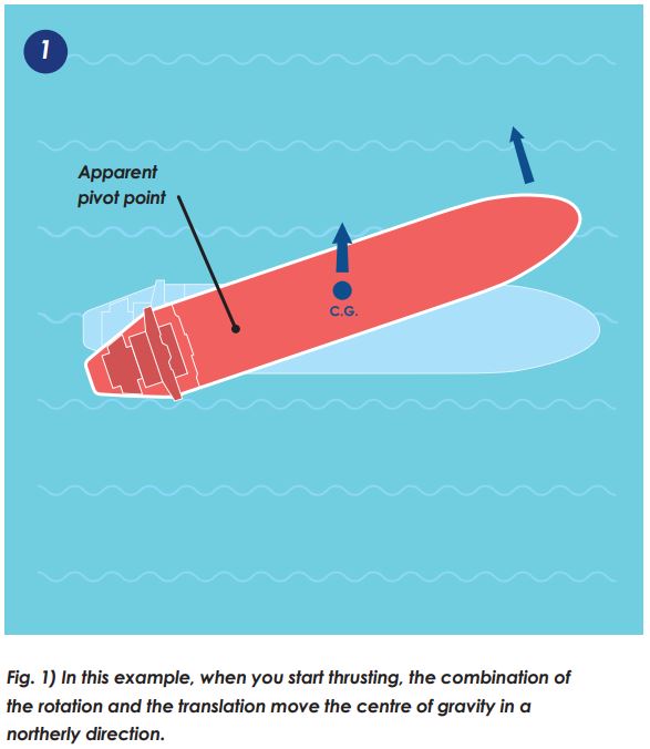 It is common for pilots to realise, when the bow thruster has been in action for a while, that not only the ship turns but it also ains forward speed. A common explanation is that the low pressure created at the suction of the bow thruster would pull he ship ahead. This effect can also occur when turning the ship with the push of a tugboat or a rope pulling at 90° (on a small-scale vessel). In these cases, though, no area of low pressure is acting on the hull. The explanation has to lie somewhere else.In the case of a side force applied at the stern of a ship, the same principle applies. The azipod, the stern thruster or the pushing tug can, in addition to the desired swing, create sternway.