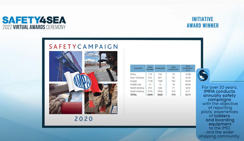 International Maritime Pilots’ Association (IMPA) received the 2022 SAFETY4SEA Initiative Award for conducting annually its ‘Pilot Ladder Safety Campaign’ with the objective of reporting pilots’ experiences of ladders and boarding equipment to the IMO and the wider shipping community. Other distinguished short-listed nominees of this category were: Inmarsat, International Marine Contractors Association (IMCA), Safetytech Accelerator and Seafarers Hospital Society.