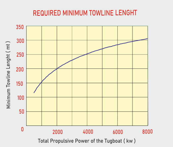 The graph showing the determination of the minimum tow length to be used in the bollard pull test according to the value of the total engine power (kw) of the tug is shown in Figure-5 below. As can be seen in the figure, a tugboat with a total of 4000 kW engine power should require a minimum tow length of 250 meters when performing the test.