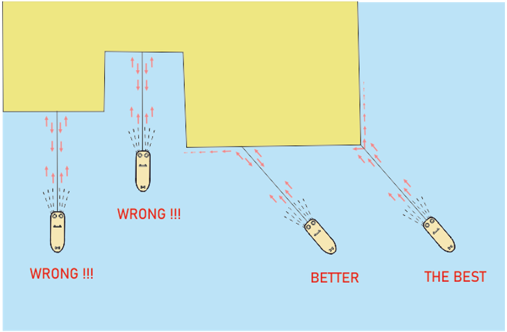 In order to fix the tow rope, if there is no place like a legged jetty, a method should be applied as shown in Figure-2 below, where the propeller wake of the tug will not be interrupted and will not return.