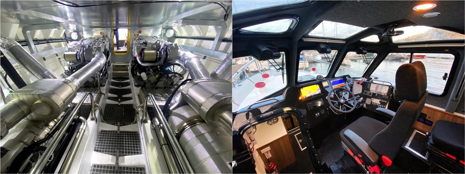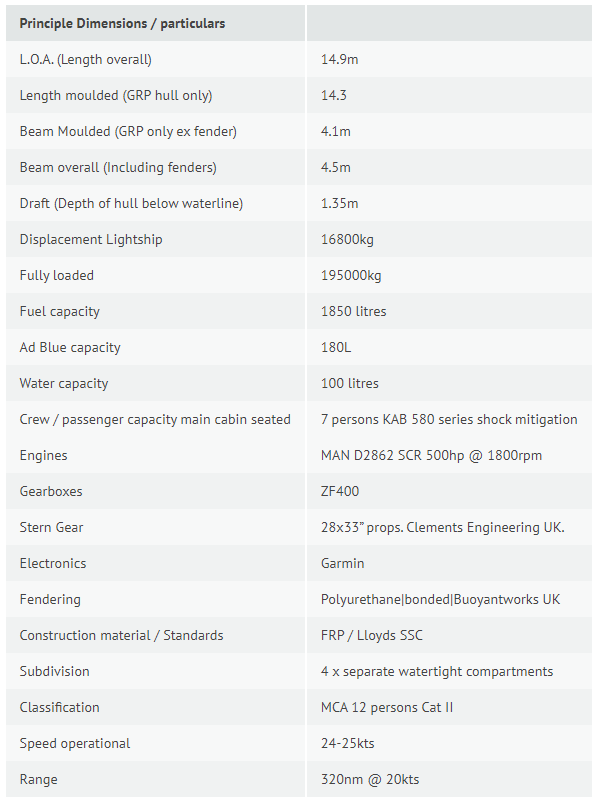 South Esk’ will be used for the ports pilotage operations. Powered by a pair of MAN D2862 SCR 500hp TIER III engines. The engines are IMO Tier III compliant and fitted with SCR exhaust scrubbing units lowering emission. She has a 24-25kts operational speed and proved very economical using as little as 50l/phr from each engine at 20kts. Capable of carrying a total 7 pilots and crew. Her accommodation is very well appointed and fitted out, providing a central helm position for optimal vessel control fitted with a full array of Garmin navigation equipment. KAB shock mitigation seating ensures crew and Pilot comfort during transfers and she provides full live aboard facilities in her spacious lower forward cabin allowing for extended operations. Incorporating all Safehaven’s usual pilot boat features including special polyurethane bonded fendering system to fully protect her during boarding operations in heavy weather and fitted with additional bow fendering allowing for ‘pushing manoeuvres’ to assist in smaller ship dockings. South Esk is fitted with Safehaven’s proven MOB recovery platform.