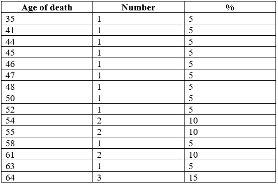 Table-1 Below shows the causes, number and percentages of death included in the study:The most intense ranges in the death age range are 61-65 (6 deaths-30%) and 51-55 (5 deaths-25%). The youngest death is 35, while the oldest is 64.
