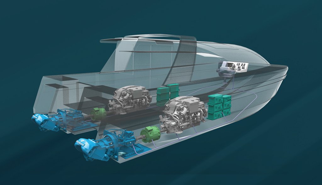 The control system manages the hybrid energy flow between engines, batteries and motors, while charging and discharging the batteries as required. A simple automatic setting enables effortless vessel operation, while a manual setting delivers four different modes of operation – Diesel Only, Electric Only, Charging or Electric Boost.