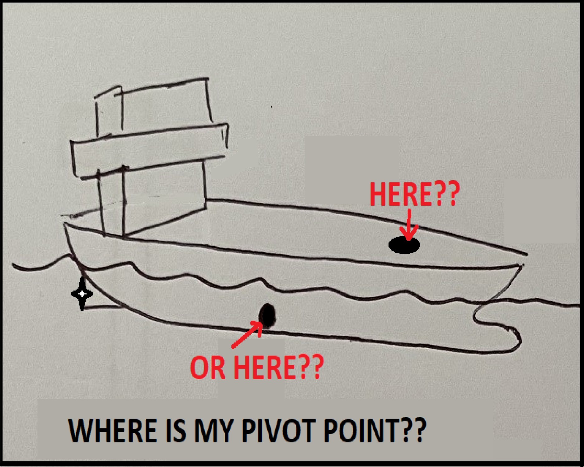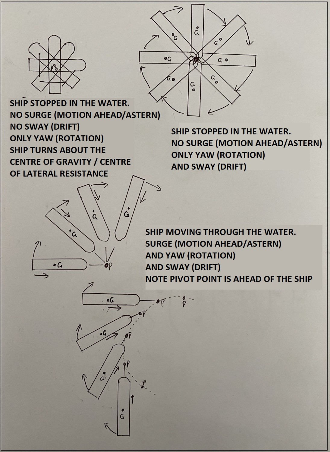 The ‘traditional’ pivot point theory of ships: The position of the pivot point on a moving ship should be right ahead or right astern depending on direction of motion but the friction of water causes a resistance therefore the pivot point settles in a position as indicated in the top diagram.