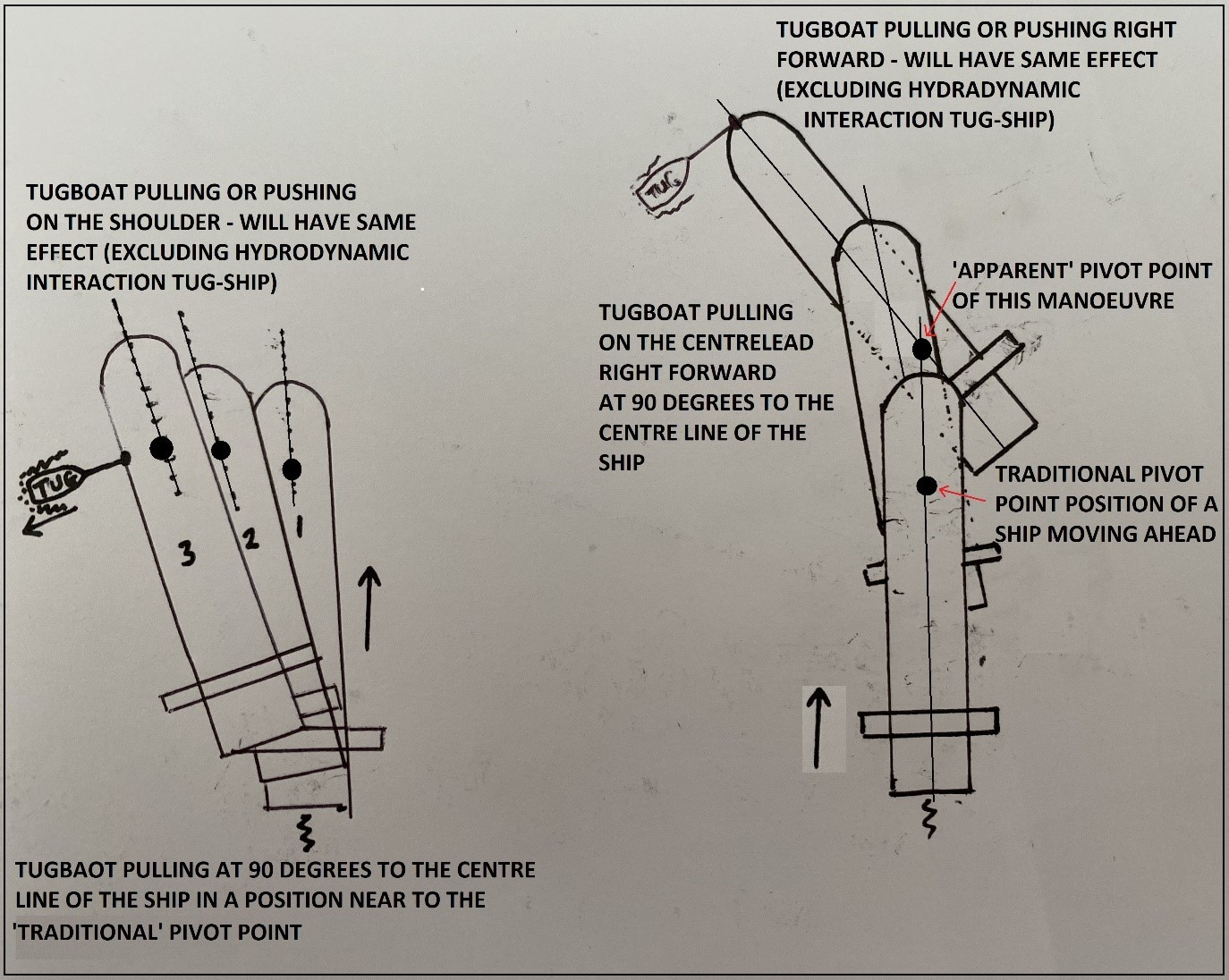 A tug pushing at the position of the pivot point should have no turning effect because there is no lever, but instead may cause sideways movement of the ship if the force is big enough. This idea has been challenged by the new ‘pivot point’ theory.