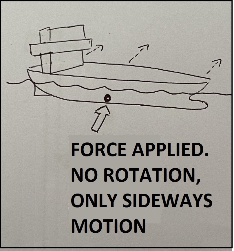 The diagram also shows that when lateral (sideways) forces are applied to the ‘traditional’ ‘pivot point’ position of a ship moving ahead this does have an effect because the ‘real’ pivot point is further aft than what is “seen” by the ship handler. There is a lever.