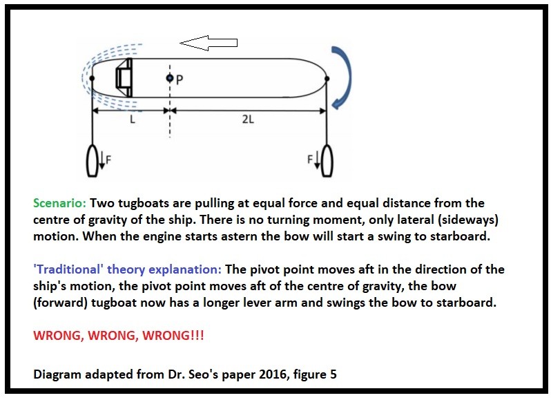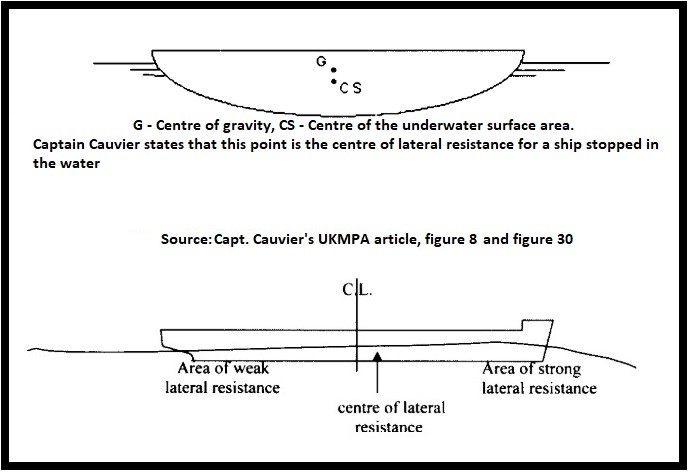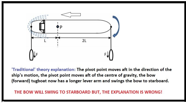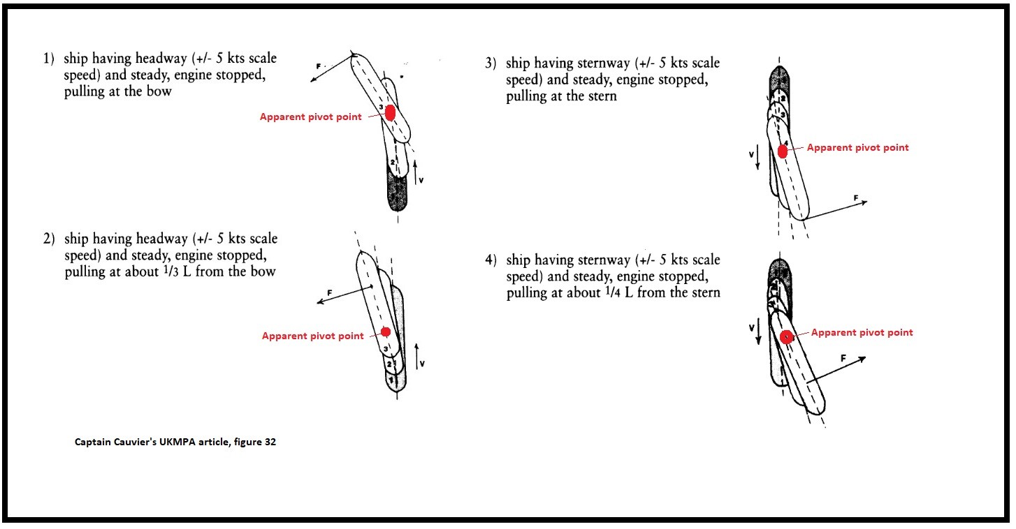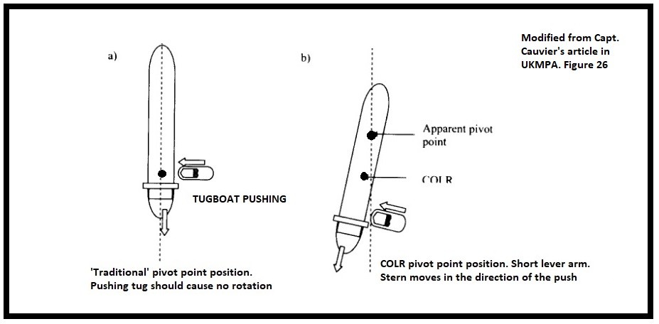 He sends another nod to Captain Cauvier when he writes about the above scenario … “The account is mistaken in two aspects. One is that the pivot point is treated as a physical entity (as the fulcrum) … the other that the pivot point is treated as the cause. The correct explanation is that when the ship starts to move astern, the centre of lateral resistance moves sternwards from midship. Thus the reactive hydrodynamic forces providing an extra turning force about the centre of gravity. The tugs are pulling the ship to starboard. The starboard sway causing the pivot point to appear between the centre of gravity and the stern as the result.”