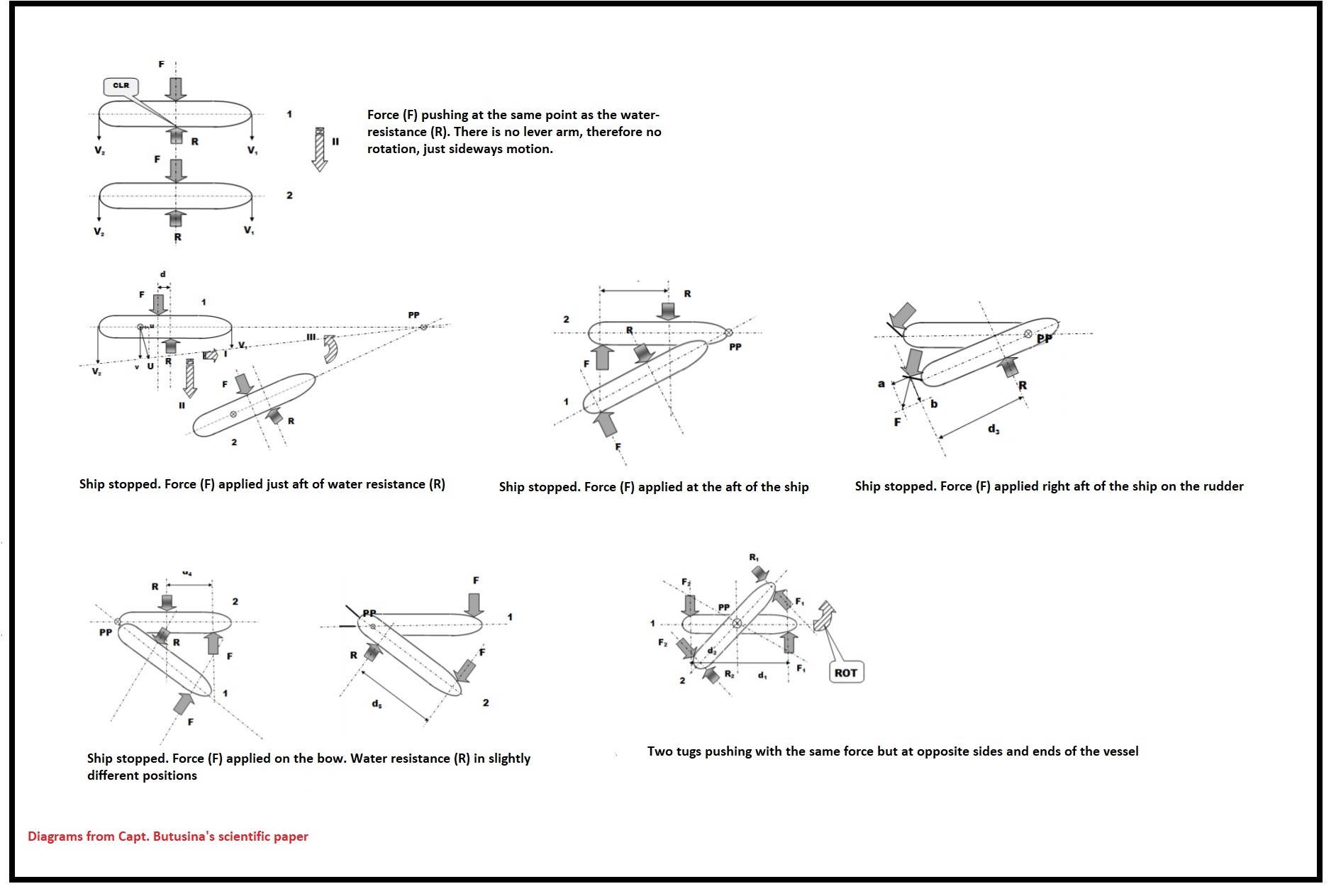 Captain Butusina explains that for a ship stopped in the water you will find a point situated near the mid length where a tug pushing with a force (F) will cause the forward and aft extremities of the ship to move at the same speed. This is because the force is applied at the same point as the water-resistant force (R), the Centre of Water (Lateral) Resistance (CLR). Because the lever of F-R is zero, the ship will move sideways but will not rotate.